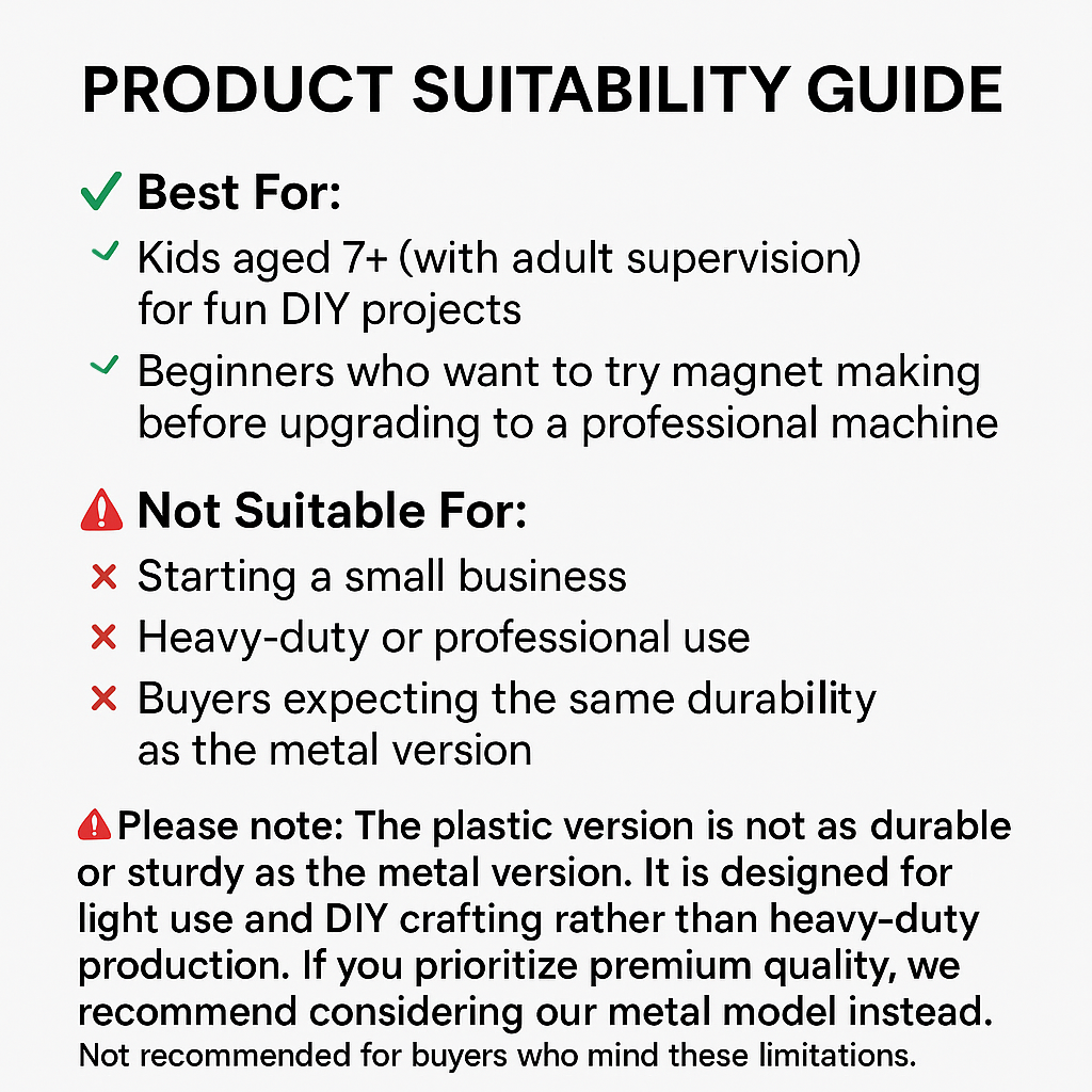 Please note: The plastic version is not as durable or sturdy as the metal version. It is designed for light use and DIY crafting rather than heavy-duty production. If you prioritize premium quality, we recommend considering our metal model instead.Not recommended for buyers who mind these limitations.